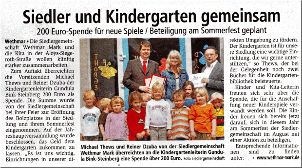 200 EUR Spende der Siedlergemeinschaft an die Kindertagesstätte in der Wethmar Mark, Aloys-Siegeroth-Str.
